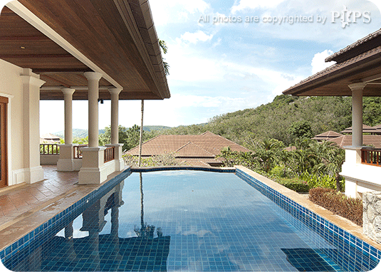 This two-storey villa has been built on a hillside, offering panoramic views of the lush mountains and the Andaman Sea beyond. Every room has been designed to take advantage of the magnificent views. This four-bedroom villa comes with four en-suite bathrooms with showers, the one in the master bedroom also comes with a Jacuzzi, a spacious fully-equipped kitchen and terraces and a 7x5 m. swimming pool.