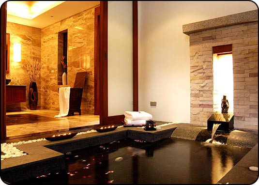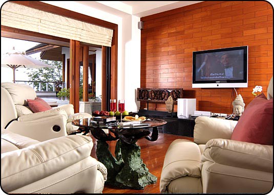 Upper Level The main entrance to the house is gained by stepping across the pond and into the main living room. This room is equipped with a 42 inch flat screen TV, DVD player, cable TV and a surround sound system. It also has full reclining leather sofa and chairs to seat six. This room leads out to the pool area which has a large sun deck and a shaded deck.