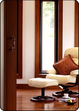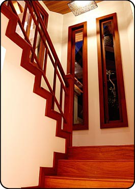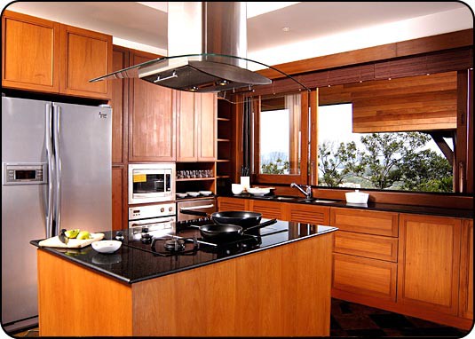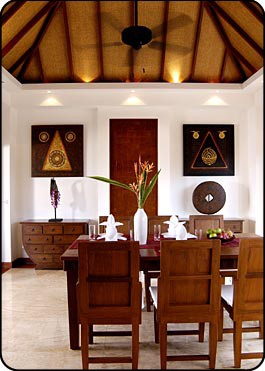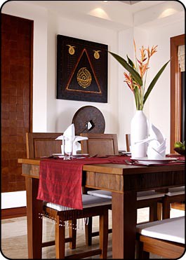 Leading off the shaded deck are the main stairs down to the lower level and the entrance to the dinning room. The teak dining table can seat eight comfortably and the room is decorated with Thai artifacts and pictures. The kitchen is next to the dinning room and fitted as a modern western kitchen. It has plenty of cupboard space, large fridge, oven and cooking hob.