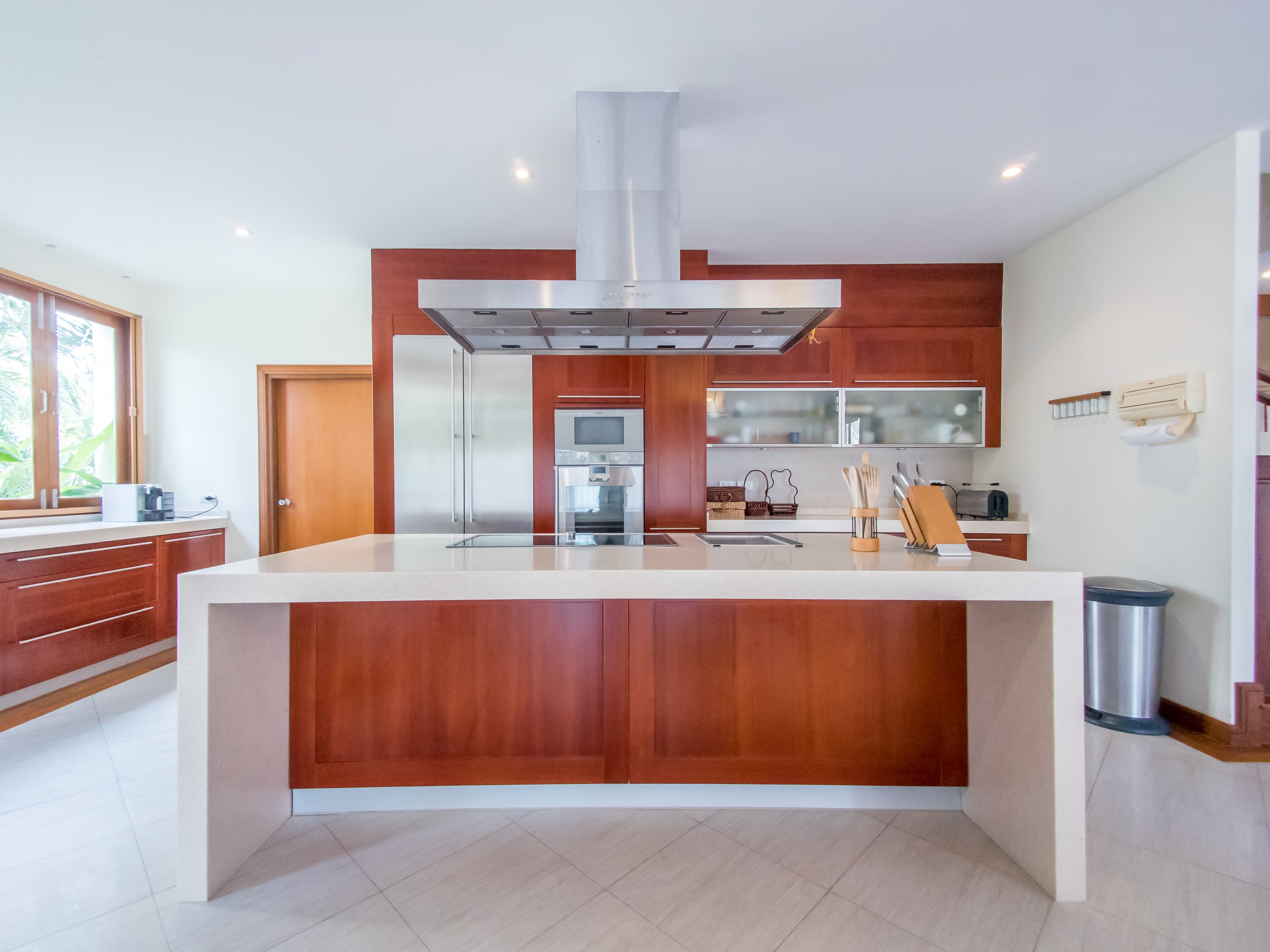 The kitchen is modern and fully fitted, with high-end Gaggenau appliances, including an island with a fitted teppanyaki grill. The maid area and laundry is to rear of the kitchen area.