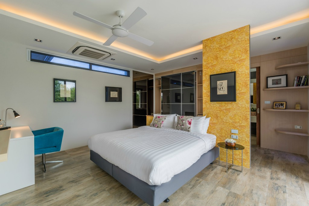The villa features five bedrooms each with their own en-suite bathroom. Two twin—beds guest rooms are on the ground level and 2 master suites with King-size beds on the upper level which both include a bathtub and a natural outlook to the tree tops. A fifth bedroom can accommodate additional guests queen-size which also has its own en-suite bathroom with shower (the bedroom is accessible from outside the villa).The master suites are decorated with Picasso prints and open out onto their own private sun terraces.