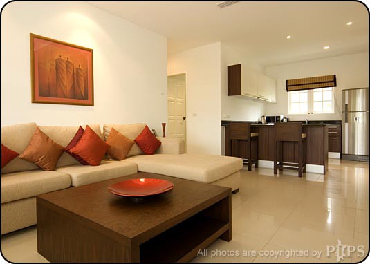 Like other two-bedroom apartments in the development, this apartment offers a big living area that comes with a three seater sofa and one additional armchair while the European-designed kitchen is set at the other side. It is also from here that the veranda can be accessed.